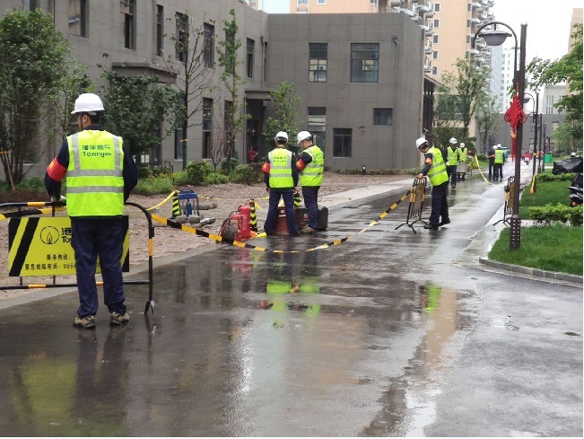 當(dāng)天下午15時(shí)30分,公司調(diào)度中心接到報(bào)警:迎江府小區(qū)地下管道遭施工方破壞,造成天然氣泄漏,需緊急處理。接到報(bào)警后,安慶港華維搶人員立即驅(qū)車趕至現(xiàn)場,依據(jù)預(yù)案要求,各就各位地迅速展開應(yīng)急搶險(xiǎn)工作:探漏組仔細(xì)檢測事發(fā)區(qū)域周邊的燃?xì)鈹?shù)值;警戒組對(duì)泄漏點(diǎn)上風(fēng)向30米、下風(fēng)向50米處進(jìn)行警戒,并疏散周邊圍觀群眾及車輛;搶修組立即確定遭破壞管徑及搶險(xiǎn)物資,并上報(bào)現(xiàn)場情況。