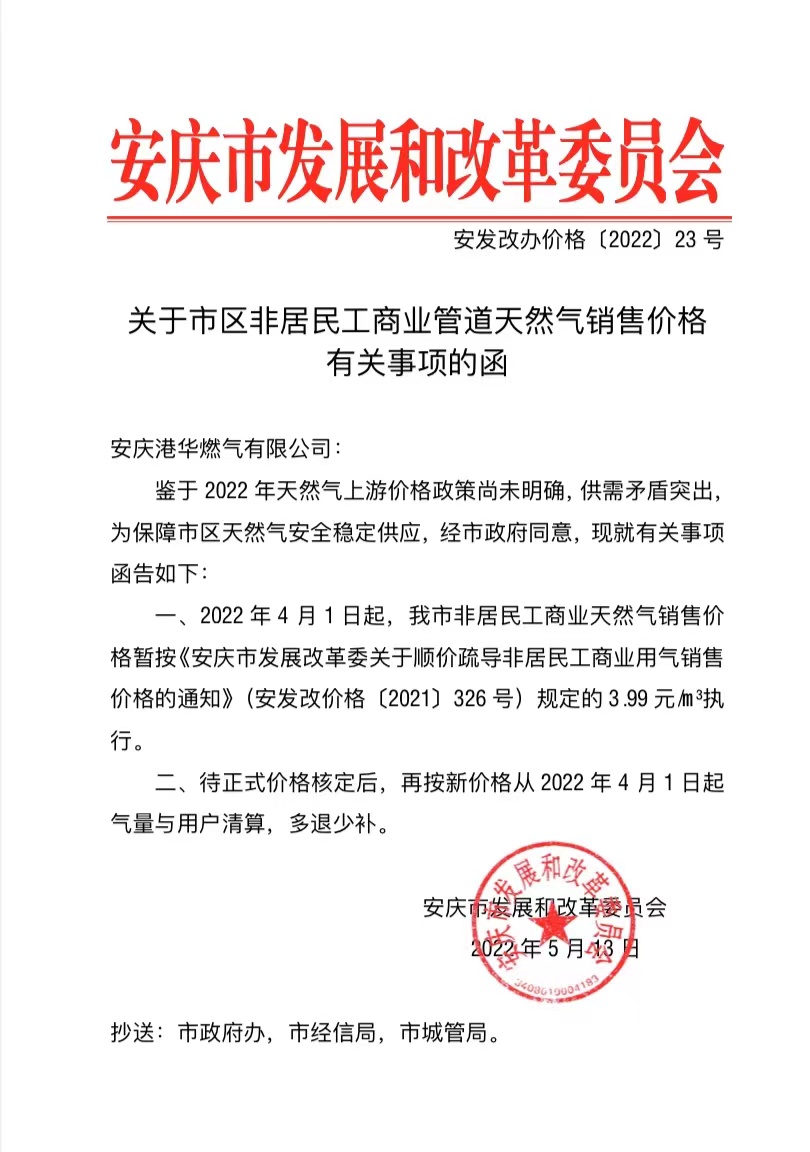關于市區(qū)非居民工商業(yè)管道天然氣銷售價格有關事項的函(安發(fā)改辦價格〔2022〕23號)