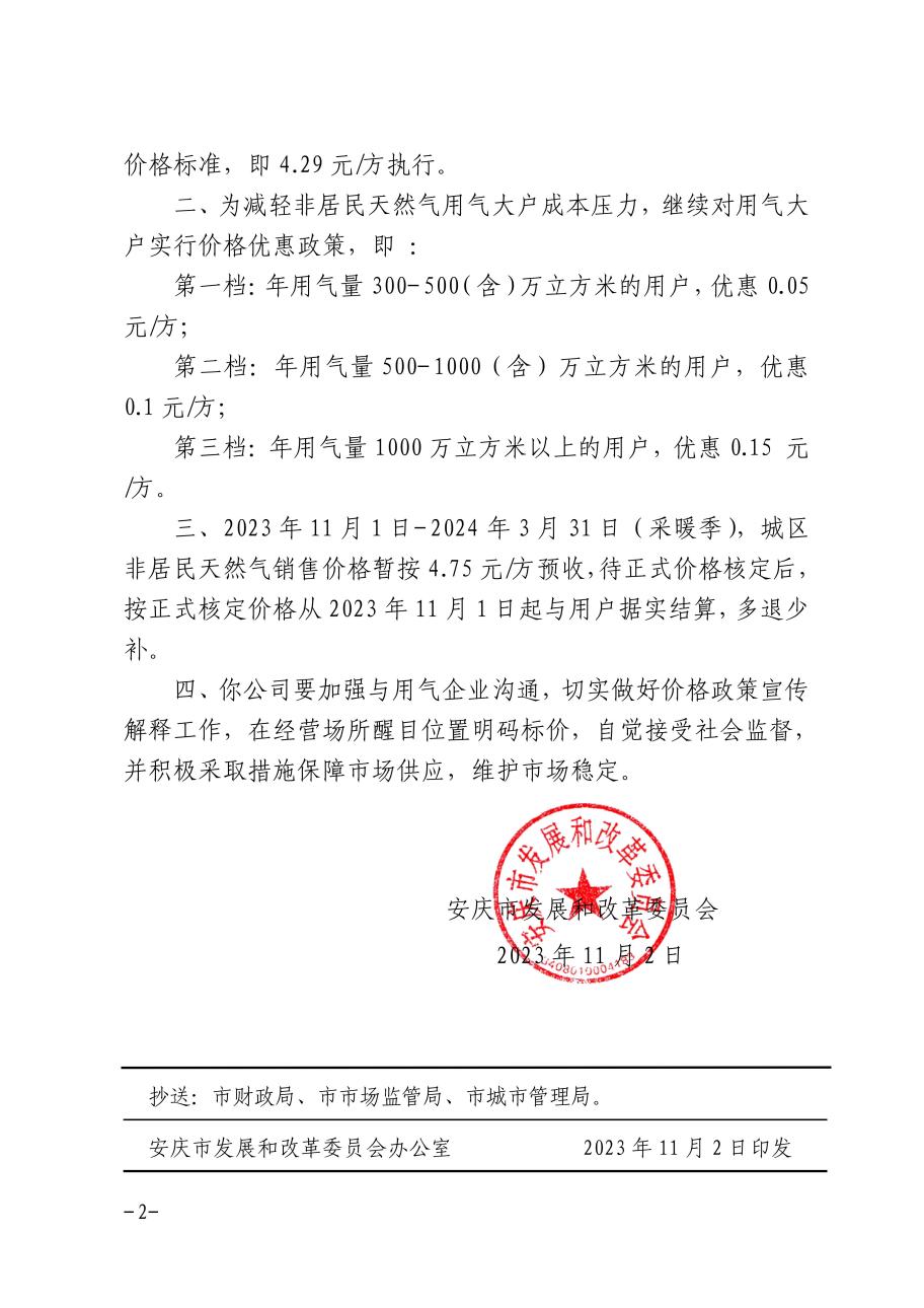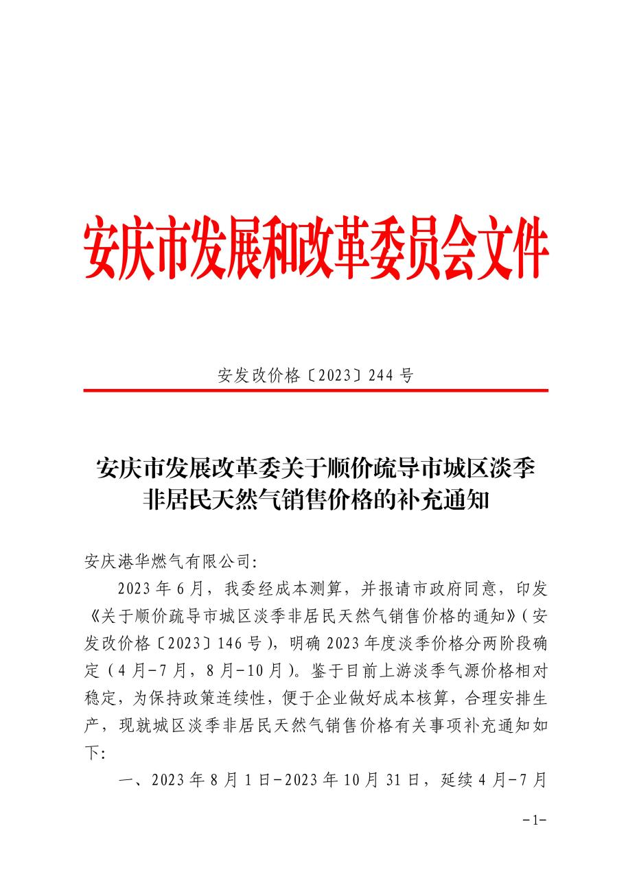 安慶市發(fā)展改革委關(guān)于順價(jià)疏導(dǎo)市城區(qū)淡季非居民天然氣銷(xiāo)售價(jià)格的補(bǔ)充通知 發(fā)布時(shí)間:2023-11-07    閱讀次數(shù):7310次