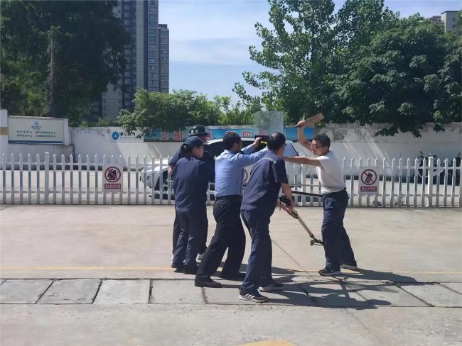 演練模擬了一起發(fā)生在加氣站的歹徒持刀威脅加氣工作人員的惡性事件。站內(nèi)員工發(fā)現(xiàn)嫌疑人員后,手持盾牌及警棍立即上前阻攔,其他人員及時配合并撥打轄區(qū)民警電話報警,站內(nèi)員工利用警棍、鋼叉等防衛(wèi)武器配合到達現(xiàn)場的民警將歹徒制服。