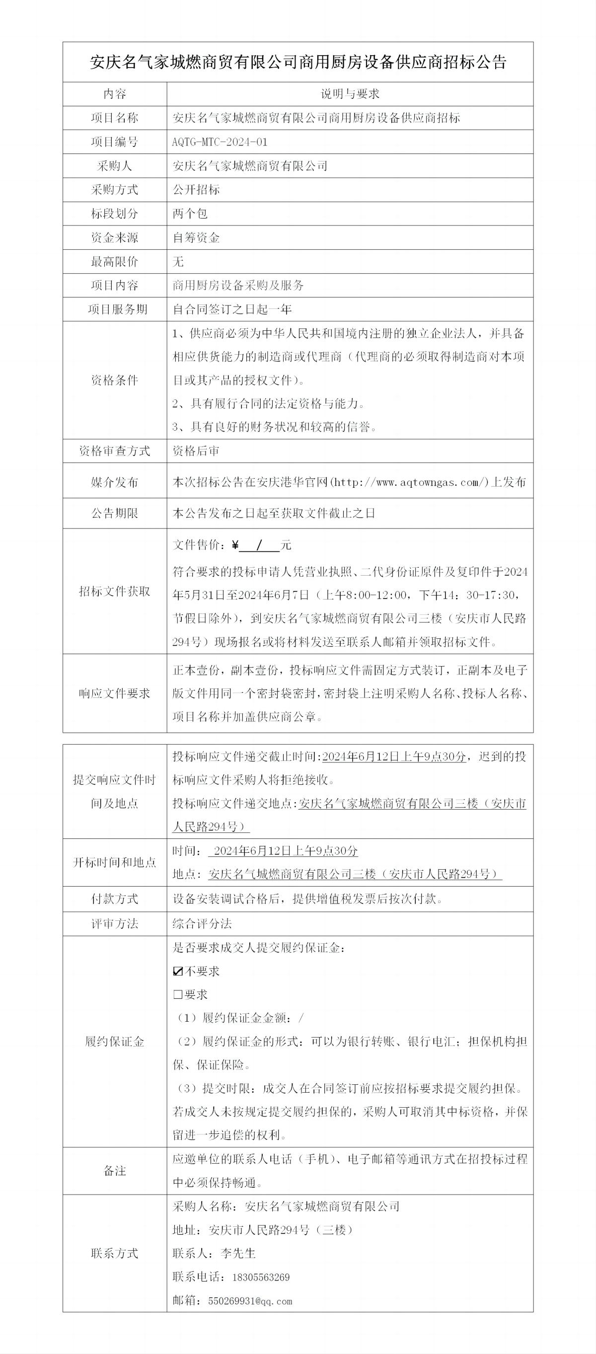 安慶名氣家城燃商貿(mào)有限公司商用廚房設(shè)備供應(yīng)商招標(biāo)公告