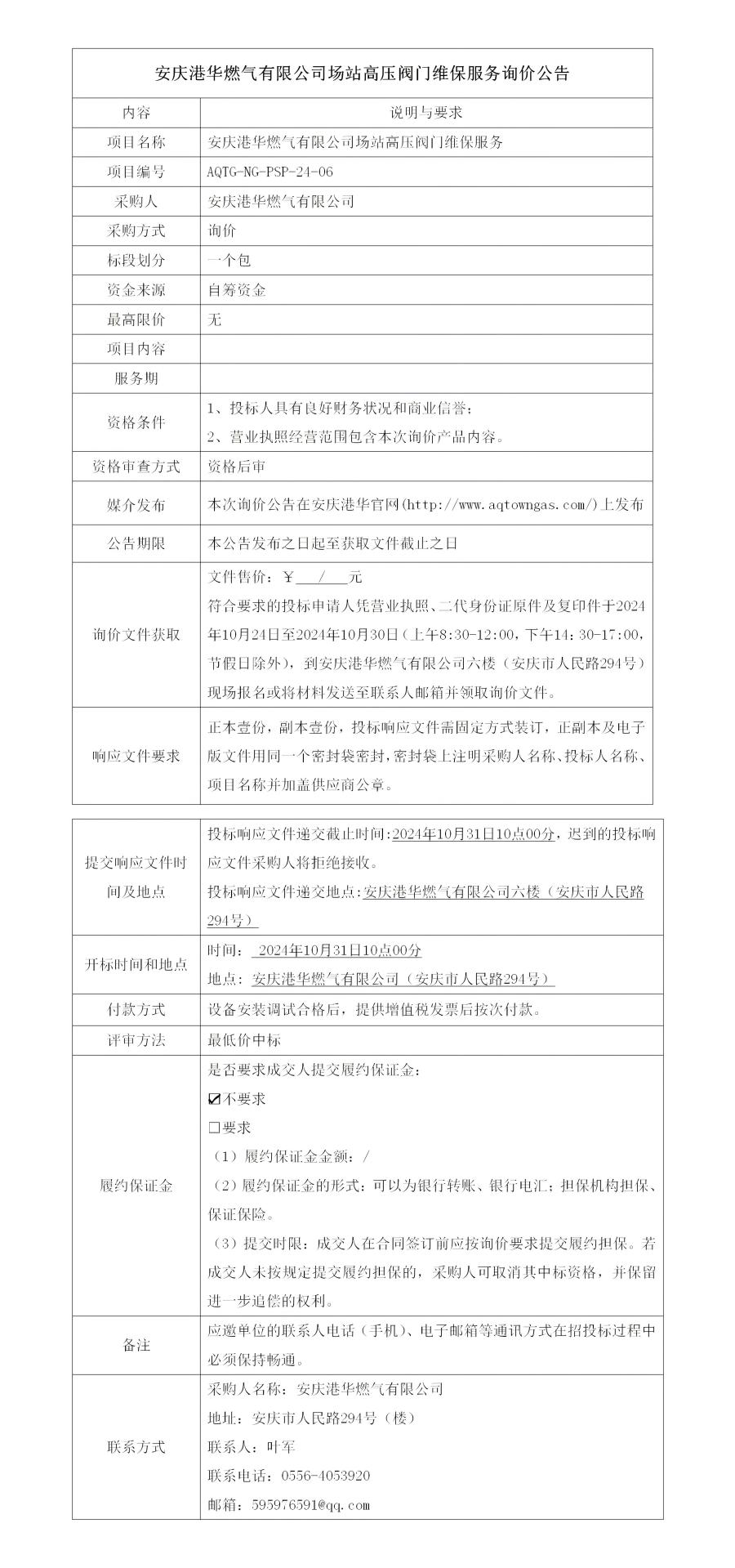 安慶港華燃?xì)庥邢薰緢?chǎng)站高壓閥門(mén)維保服務(wù)詢(xún)價(jià)公告
