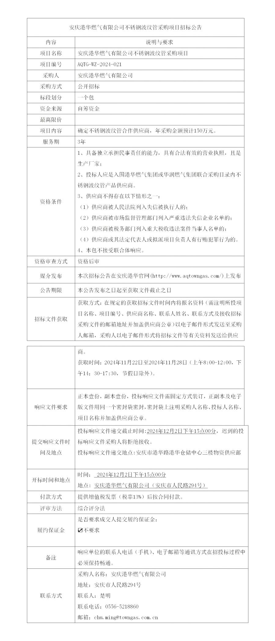安慶港華燃?xì)庥邢薰静讳P鋼波紋管采購(gòu)項(xiàng)目招標(biāo)公告 發(fā)布時(shí)間:2024-11-21    閱讀次數(shù):3268次