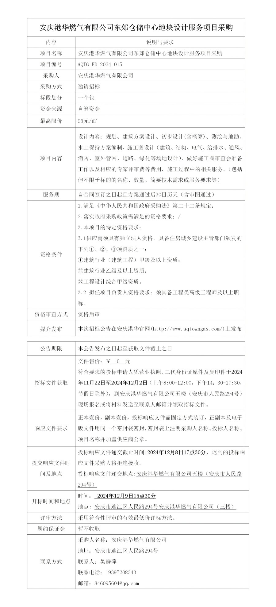 安慶港華燃氣有限公司東郊倉儲中心地塊設(shè)計服務(wù)項目采購