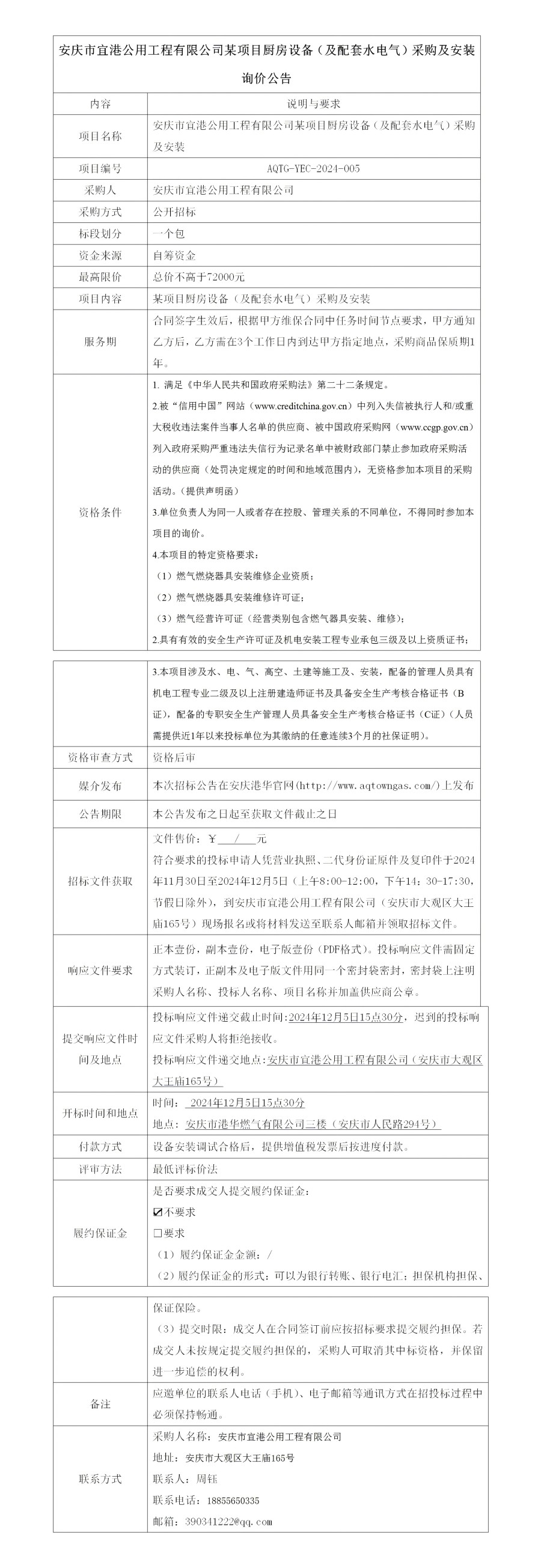 安慶市宜港公用工程有限公司某項目廚房設備(及配套水電氣)采購及安裝詢價公告