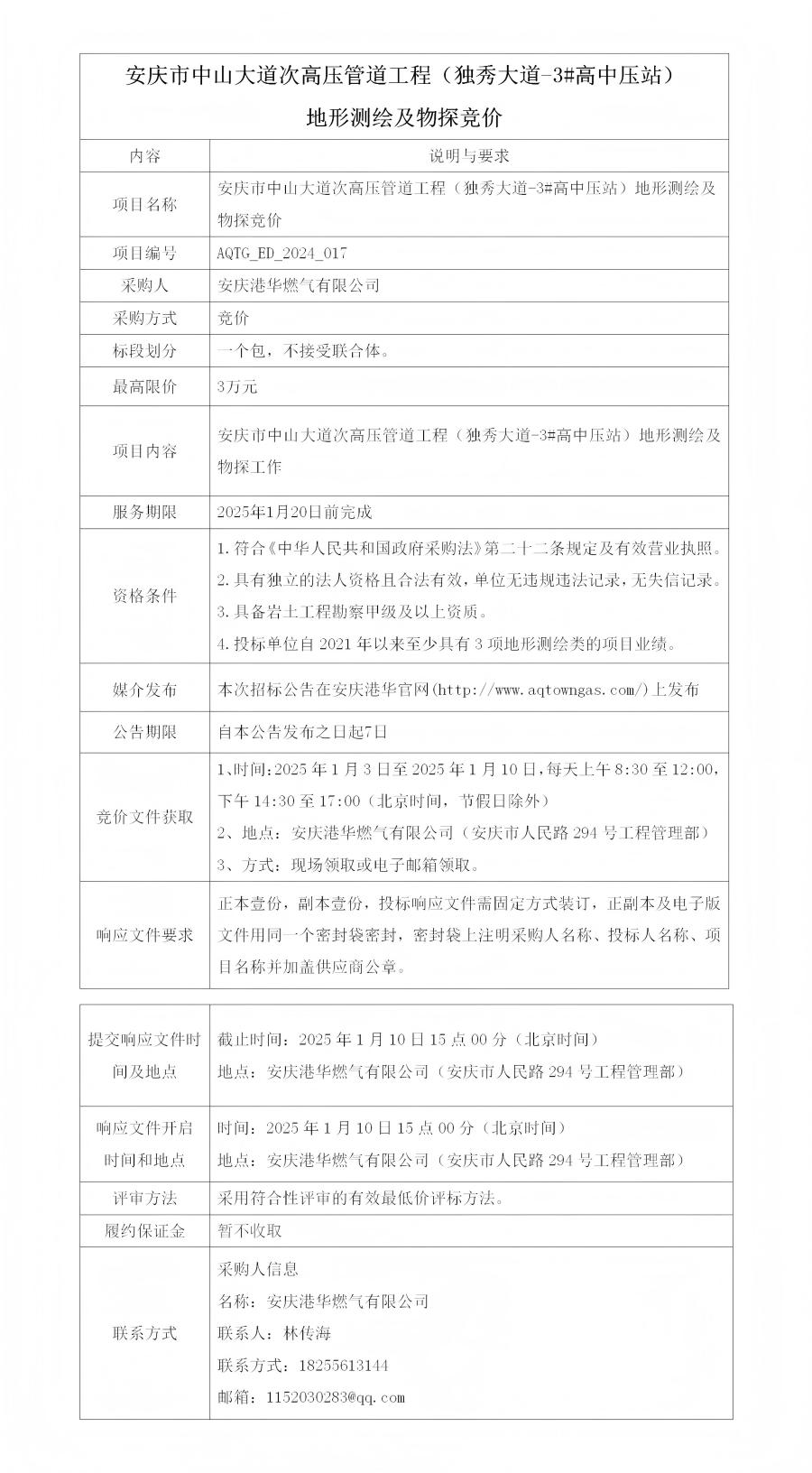 安慶市中山大道次高壓管道工程(獨(dú)秀大道-3#高中壓站)地形測繪及物探競價(jià)