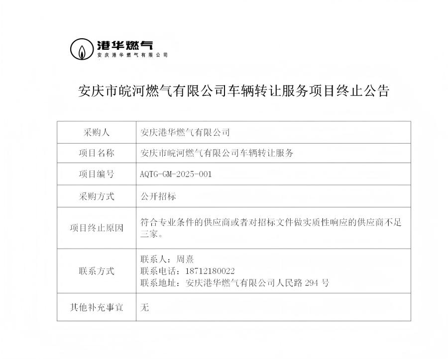 安慶市皖河燃?xì)庥邢薰拒囕v轉(zhuǎn)讓服務(wù)項(xiàng)目終止公告