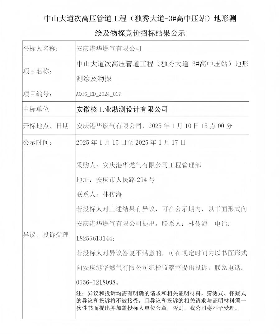 中山大道次高壓管道工程(獨秀大道-3#高中壓站)地形測繪及物探競價招標結果公示