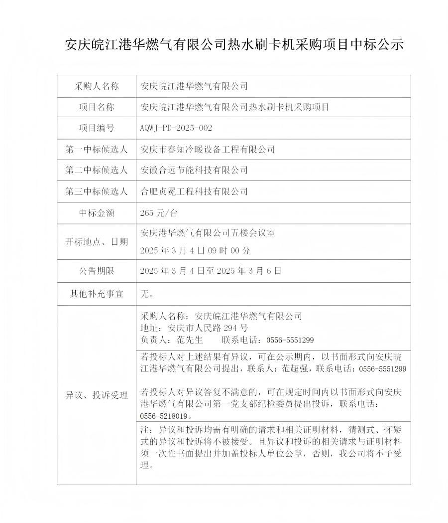 安慶皖江港華燃?xì)庥邢薰緹崴⒖C(jī)采購項目中標(biāo)公示