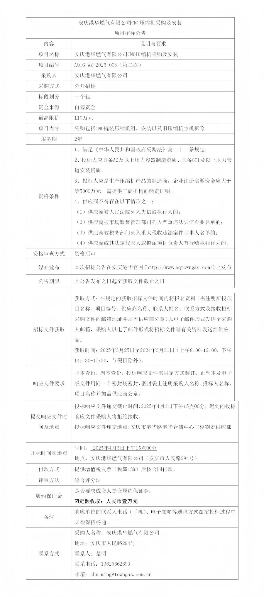 安慶港華燃?xì)庥邢薰綜NG壓縮機(jī)采購(gòu)及安裝項(xiàng)目招標(biāo)公告