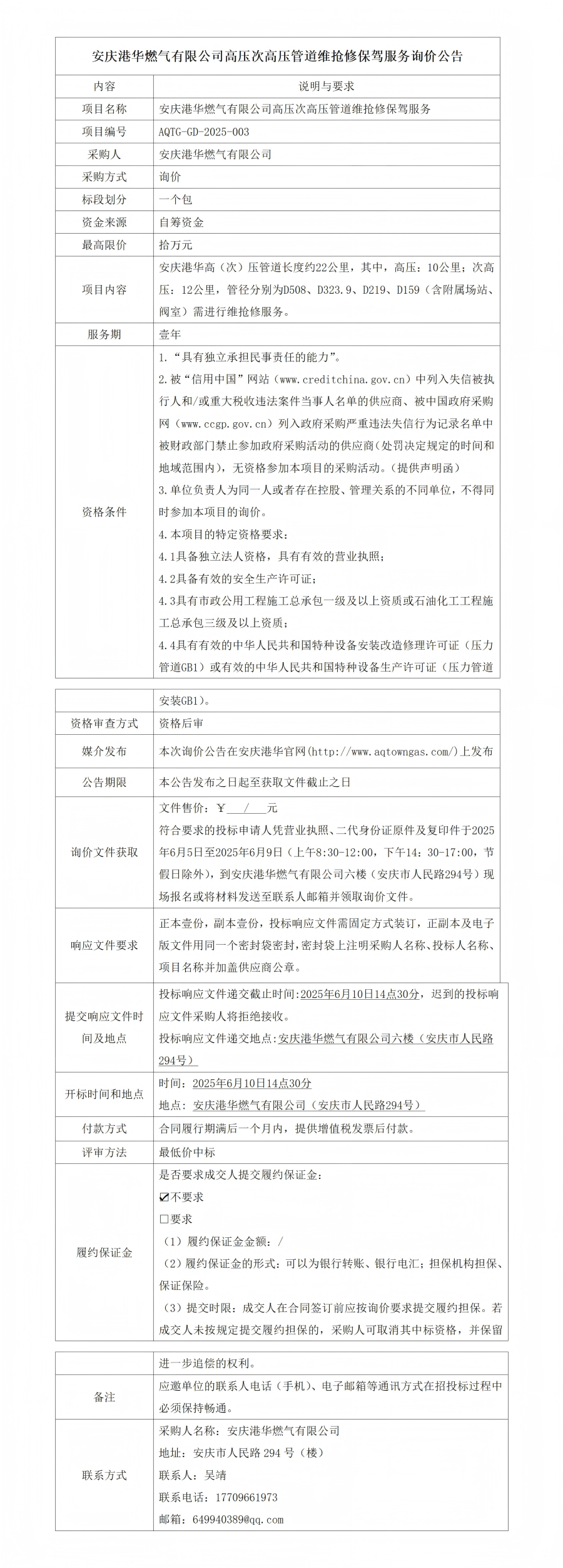 安慶港華燃?xì)庥邢薰靖邏捍胃邏汗艿谰S搶修保駕服務(wù)詢價公告