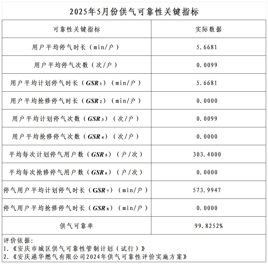 2025年5月份供氣可靠性關(guān)鍵指標
