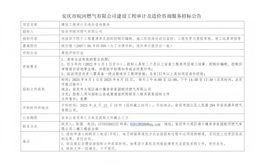 安慶市皖河燃氣有限公司建設(shè)工程審計及造價咨詢服務招標公告 發(fā)布時間:2025-08-01    閱讀次數(shù):1315次