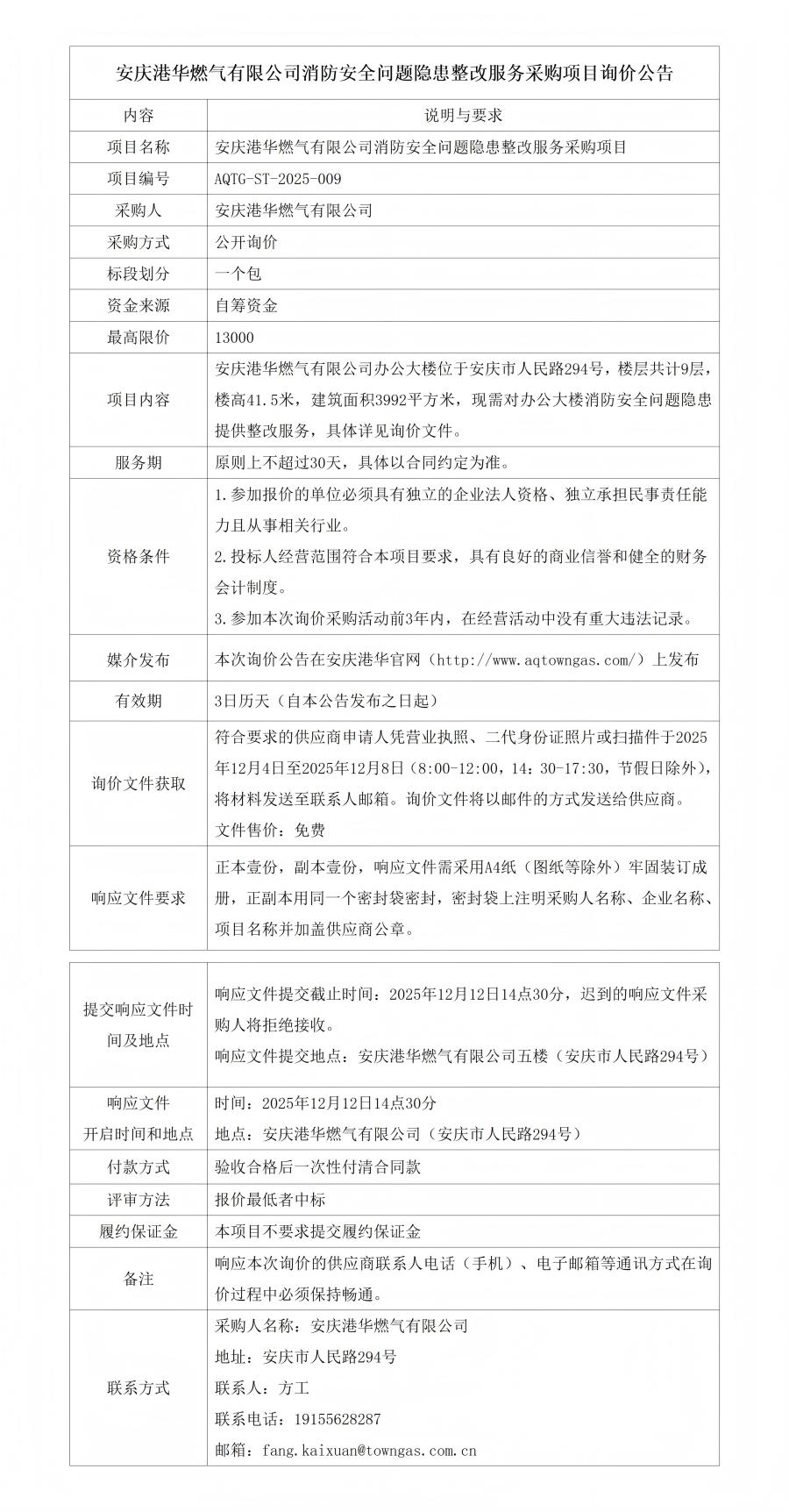安慶港華燃?xì)庥邢薰鞠腊踩珕?wèn)題隱患整改服務(wù)采購(gòu)項(xiàng)目詢價(jià)公告