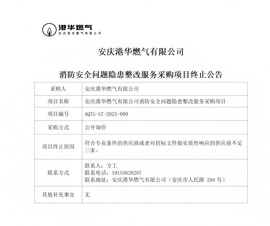 安慶港華燃?xì)庥邢薰鞠腊踩珕栴}隱患整改服務(wù)采購項(xiàng)目終止公告 發(fā)布時(shí)間:2025-12-12    閱讀次數(shù):706次