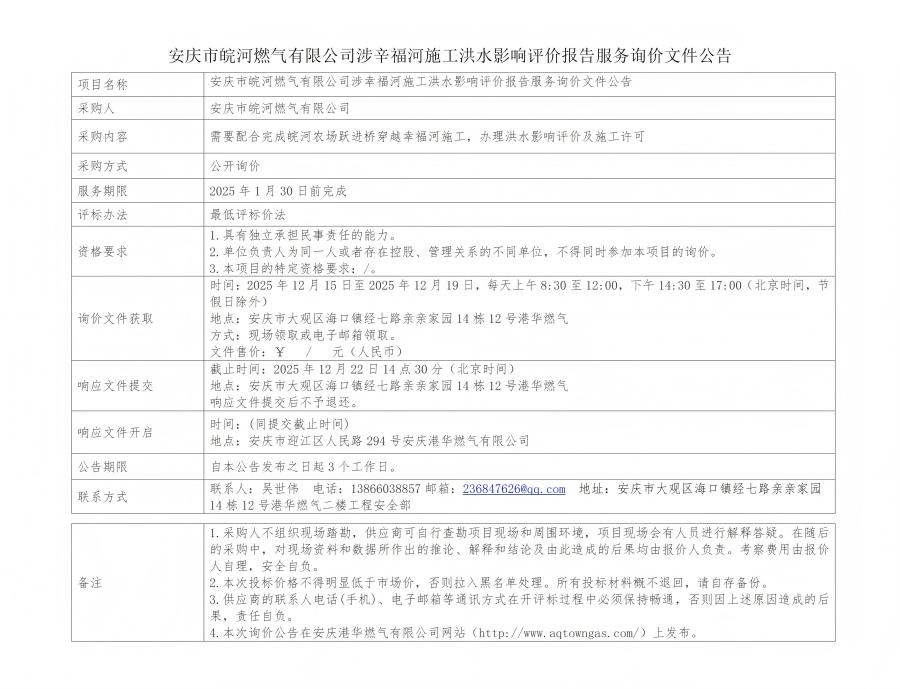 安慶市皖河燃?xì)庥邢薰旧嫘粮:邮┕ず樗绊懺u(píng)價(jià)報(bào)告服務(wù)詢(xún)價(jià)文件公告 發(fā)布時(shí)間:2025-12-15    閱讀次數(shù):814次